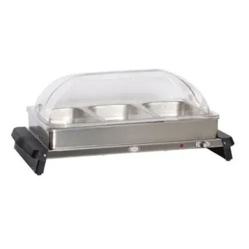 Clear roll top cover keeps prepared food hot and ready to serve Cover opens without removing for easy, more sanitary serving Variable heat controls - 155 - 205 degrees F Safety signal lights Easy to clean stainless steel warming surface Comes with 3 third size stainless steel food pans, pan holder frame 4 non skid feet Large 14'' x 20 1/2'' warming surface can also be used as a warming tray 26''W x 11 1/4''H x 15 1/4''D 120V / 300 Watts / 2.5 Amps UL/C-UL approved Full one year parts & labor warranty Elite Restaurant Equipment ensures that this product, WTBS3RT, is easy to use and install.