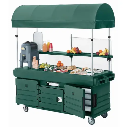 This Cambro CamKiosk Vending Cart [KVC854U-191] is an excellent way to display products and attract customers. On top it has plenty of display space and down under it has plenty of storage space. The full size food pan wells offer plenty of storage space. The casters secured at the bottom of this unit makes the unit incredibly easy to transport from one location to another. The umbrella helps attracts customers.